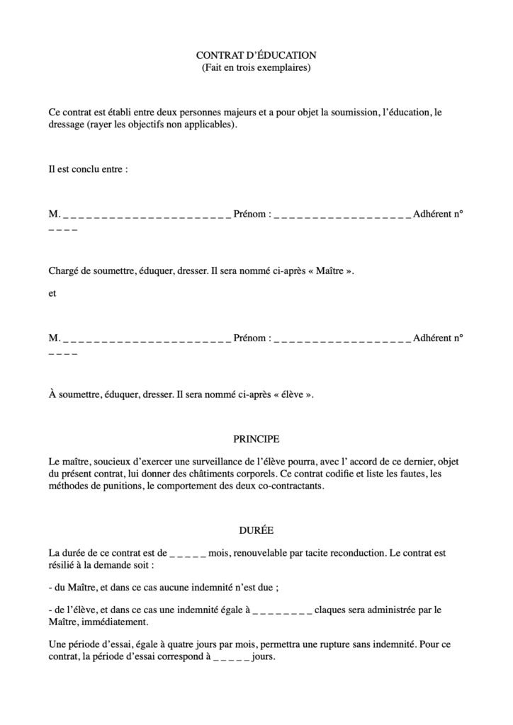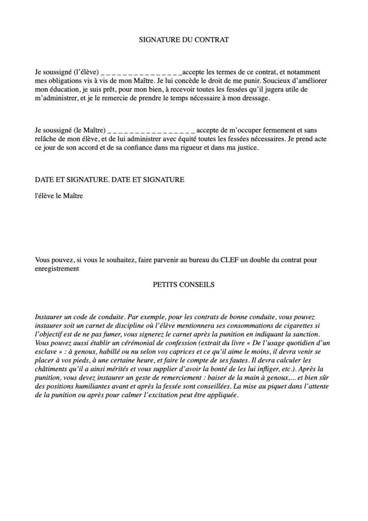 Contrat : Accord passé entre un fesseur et un fessé sur un engagement de conduite avec à la Clef des fessées en cas de mauvaise conduite. Un contrat type a été diffusé dans un récent « Fessée-magazine ».